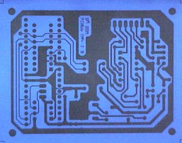 Usefull tip: For small boards just drill a 1mm hole in the corner of the board and tie 2ft of strong cotton to this. Now put the board straight into the Ferric Chloride jar with the end of the cotton outside and put the top on the jar. Keep the jar hot by heating in a tray of boiling water and gently rock to keep the etch fluid moving. Every 5mins use the cotton to lift the board out and check progress. This method is much less messy as the Ferric Chloride is always left in the glass jar.