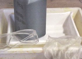 WARNING: Making PCB's requires the use of Ferric Chloride (FeCI3) which is corrosive so avoid skin and eye contact. Remember safety first use glasses, gloves and protective overalls. Ferric Chloride is also very good at distorting cloths weeks after you think you have washed it off. If you do get any on your skin then wash it off immediately with lots of water and soap.